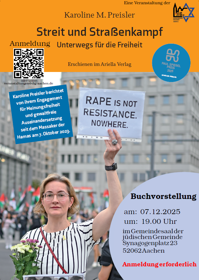Die DIG Aachen freut sich sehr, dass Karoline Preisler der Einladung gefolgt ist und uns am 07.12. im Gemeindesaal der jüdischen Gemeinde ihr neues Buch vorstellen wird.